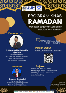 Program ini dikendalikan secara atas talian oleh Dr. Mazri Yaakob dari STML selaku moderator dengan disertai hampir 100 peserta yang terdiri dalam kalangan staf dan pelajar UUM serta orang awam.