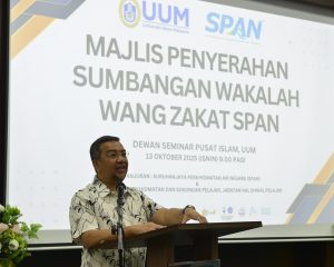 SINTOK, 15 Oktober 2025: Suruhanjaya Perkhidmatan Air Negara (SPAN) telah menyerahkan sumbangan wakalah zakat secara tunai berjumlah RM80,000 kepada 100 pelajar Universiti Utara Malaysia (UUM) di Dewan Seminar, Pusat Islam, Isnin lalu.