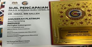 Beliau menerima pengiktirafan berprestij tersebut daripada Ketua Pengarah Pendidikan Malaysia, Dato’ Dr. Mohd Azam Ahmad sempena Majlis Apresiasi Guru Cemerlang Peringkat Kebangsaan yang telah diadakan pada 31 Januari lalu di Hotel Melia.