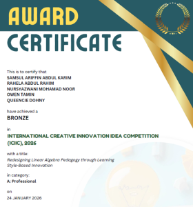SINTOK, 15 Februari 2026: Kumpulan penyelidikan Computational Statistics and Applied Mathematics (CSAM), Pusat Pengajian Sains Kuantitatif (SQS), Universiti Utara Malaysia (UUM) terus mengukir kecemerlangan di pentas antarabangsa apabila meraih satu pingat emas dan dua pingat gangsa dalam International Creative Innovation Idea Competition (ICIIC) 2026.