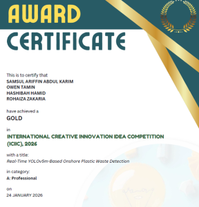 Pingat emas ini telah dianugerahkan kepada projek bertajuk “Real-Time YOLOv5m-Based Onshore Plastic Waste Detection” oleh Samsul Ariffin Abdul Karim, Owen Tamin, Hashibah Hamid dan Rohaiza Zakaria.