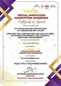 SINTOK, 8 Disember 2025: Inovasi “EMO MAP: Self-Emotion Map and Healthy Mind – An Interactive Website for Students’ Emotional Management” hasil ciptaan Dr. Norasyikin Mohaiyuddin dari Pusat Pengajian Pendidikan (SOE) dan Dr. Kamaruddin Yaakob dari Universiti Sultan Azlan Shah berjaya meraih pingat perak dalam Virtual Innovation Competition Exhibition (VICE’25), baru-baru ini.
