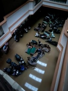 Menurutnya, penginapan mereka semua telah diputuskan bekalan elektrik dan dia bersama Dr. Muhammad Harith Zahrullail mengambil keputusan untuk pergi ke penginapan pelajar dengan berjalan kaki memandangkan air sudah mencecah paras lutut.